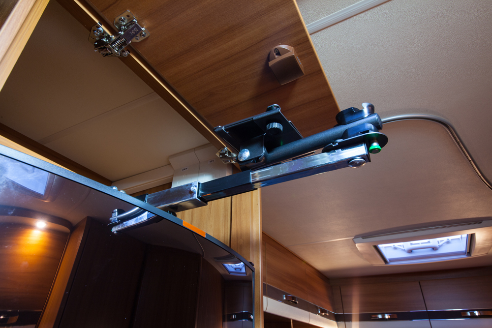 Taulu-TV:n kääntyvä teline on omassa kaapissaan jääkaapin yläpuolella. Parhaat katselupaikat ovat ohjaamon istuimilla. TV näkyy hyvin parvelle ja kääntyy myös makuuhuoneen suuntaan.