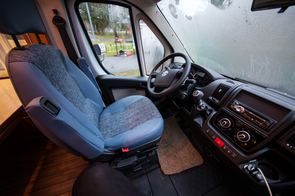 Istuinryhmä edessä on melko väljä ja kulku ohjaamoonkin on helppoa. Vasemmalla on kahdenistuttava sohva, oikealla pikkusohva.