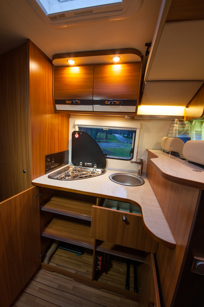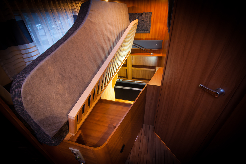 Säilytystiloja on riittävästi kaikille matkustajille. Perän parivuoteen alla on reilu tavaratila. Sisäkautta tavaratilaan päästään kääntämällä sängyn sälepohjan toinen puolisko ylös. Samalla päästää käsiksi kahteen pienempään sisäsäilytystilaan. Takatavaratila jatkuu koko auton levyisenä 15 senttiä korkeana tilana, johon sukset mahtuvat hyvin.