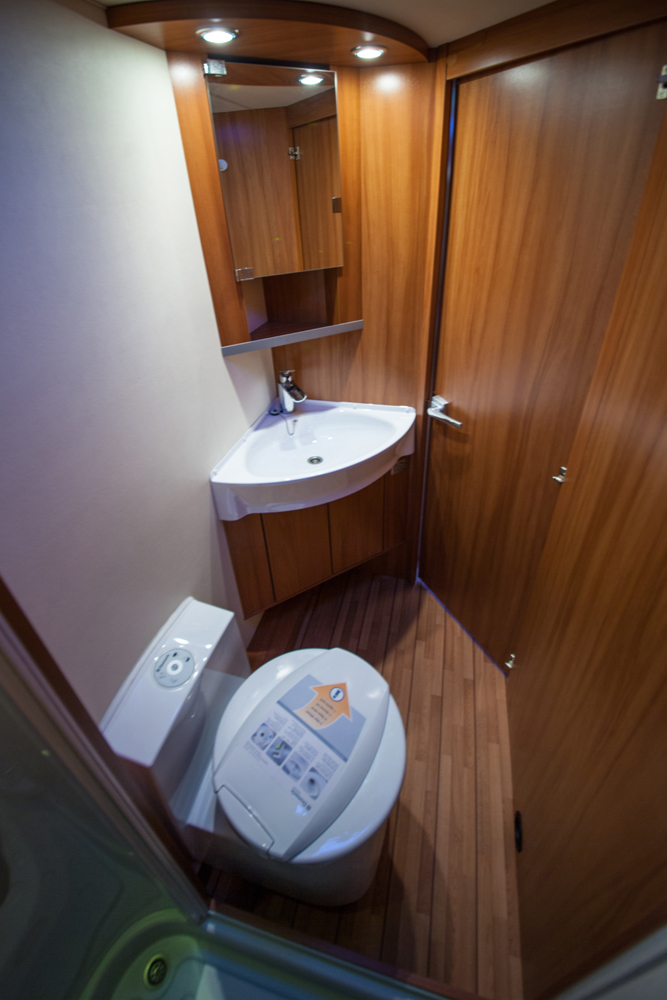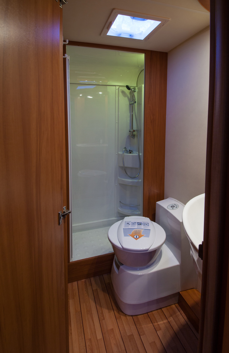 WC-tilan takana, aivan auton takimmaisessa kulmassa on erillinen suihkukaappi. Seinät, suihkuallas ja ovi ovat muovia.