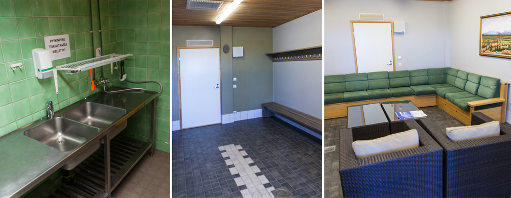 Huoltotilat löytyvät läheisen ravintolarakennuksen alakerrasta kahdesta paikasta. Melkoisen kulahtanut tiskauspaikka on entisessä saunatilassa. Takimmaisessa huoneessa, joka on entinen löylyhuone, löytyy pyykinpesukone ja kuivausrumpu. Uudempi sauna löytyy toisaalta, eri ravintolarakennuksen alakerrasta. Sauna pukuhuoneineen ja siihen liittyvä oleskelutila on melko tilava mutta turhan laitosmainen.